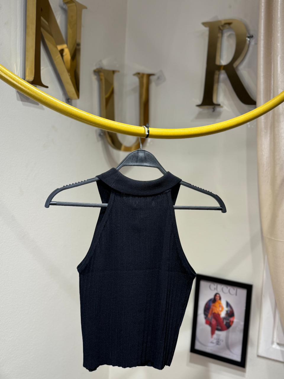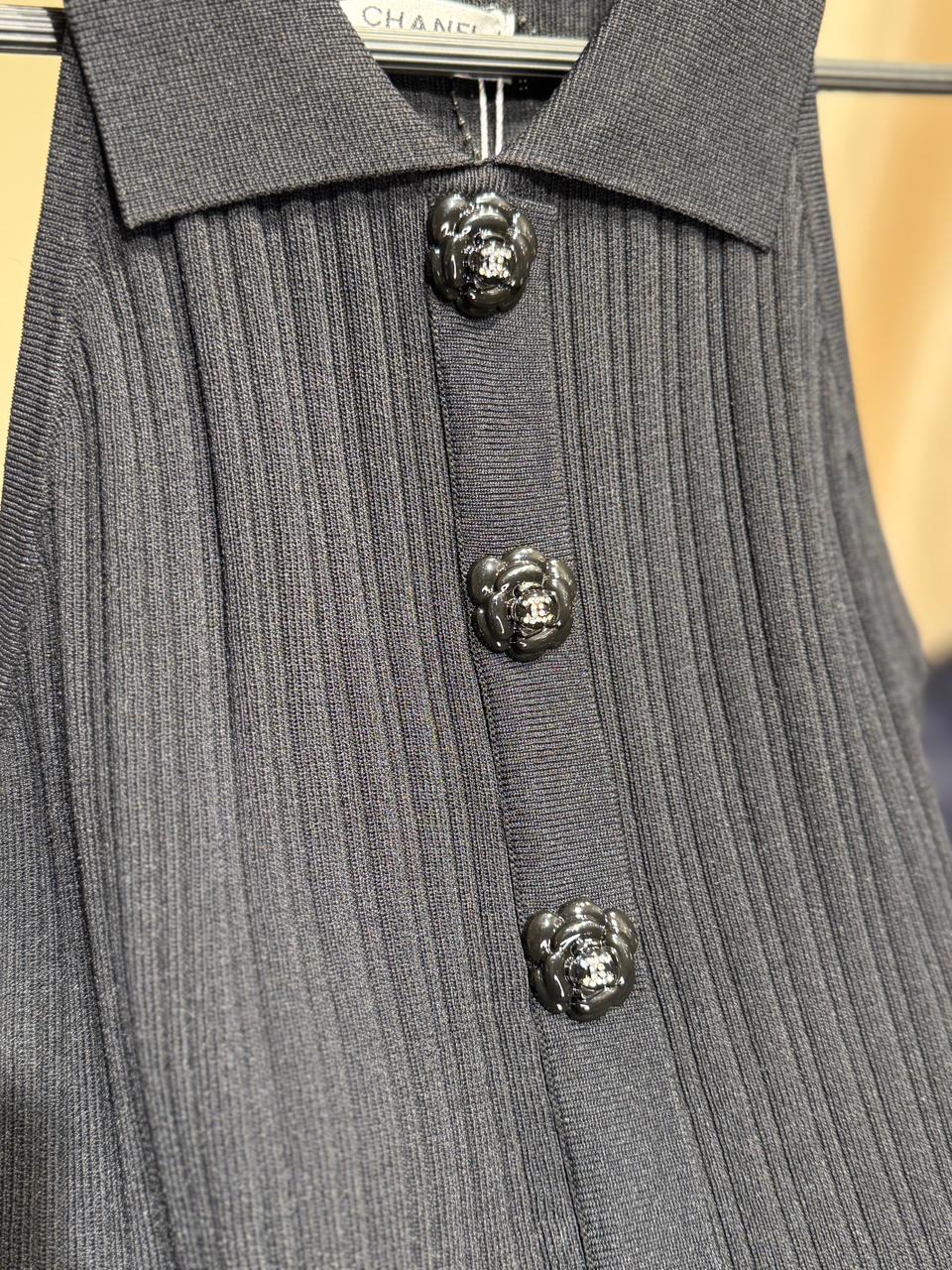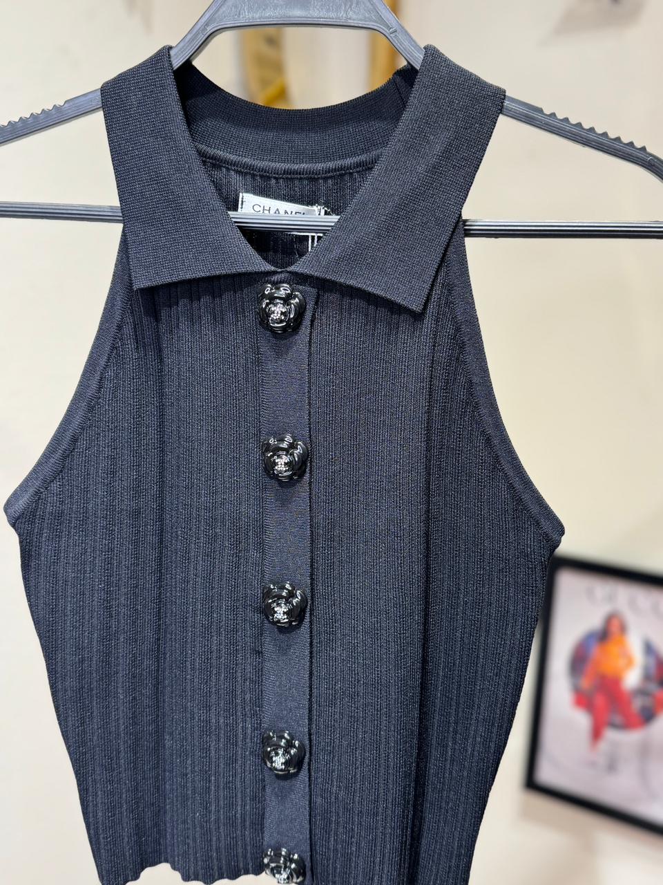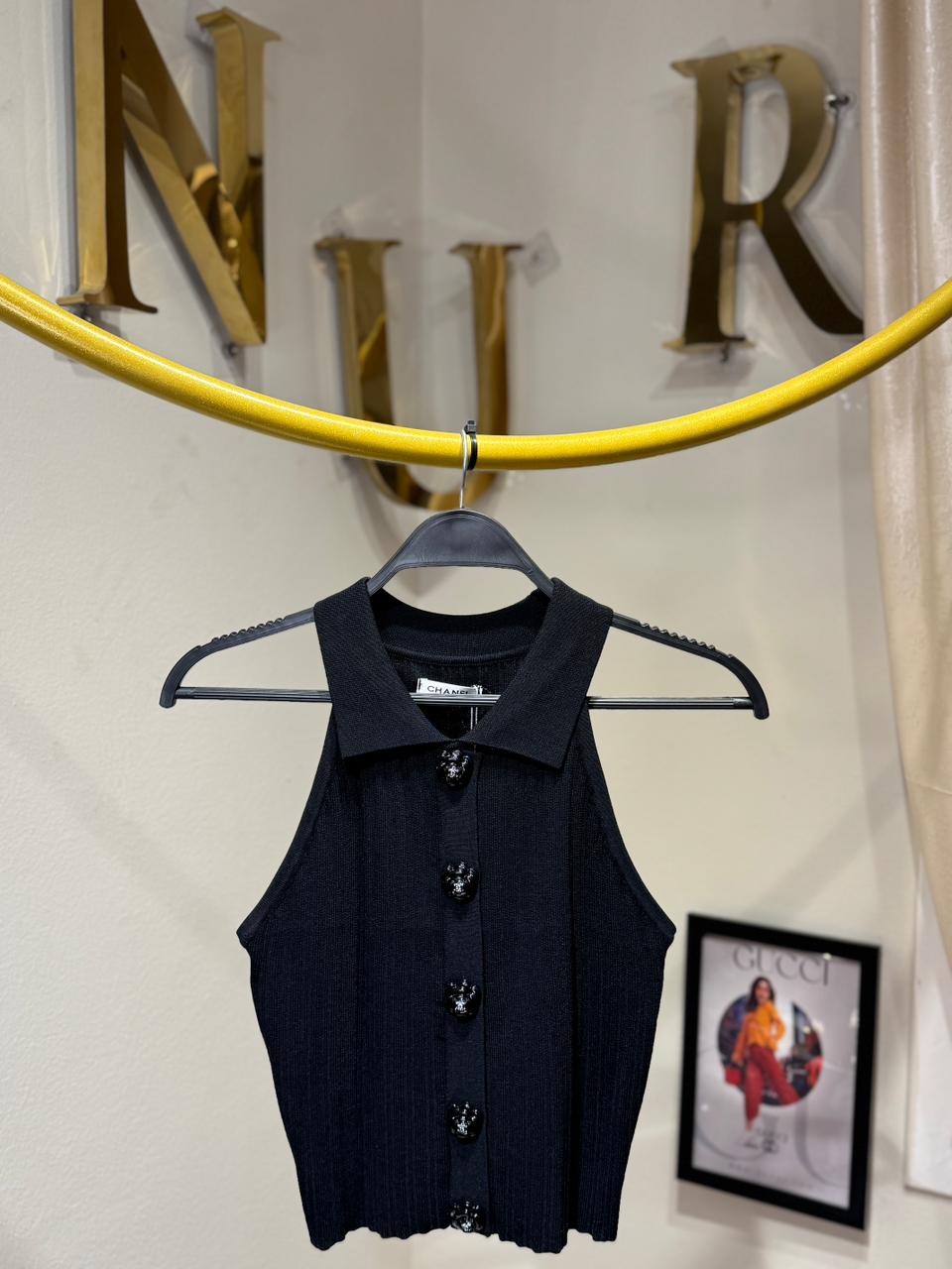 CHANEL BLACK TOP WITH BUTTON FLOWER DETAIL