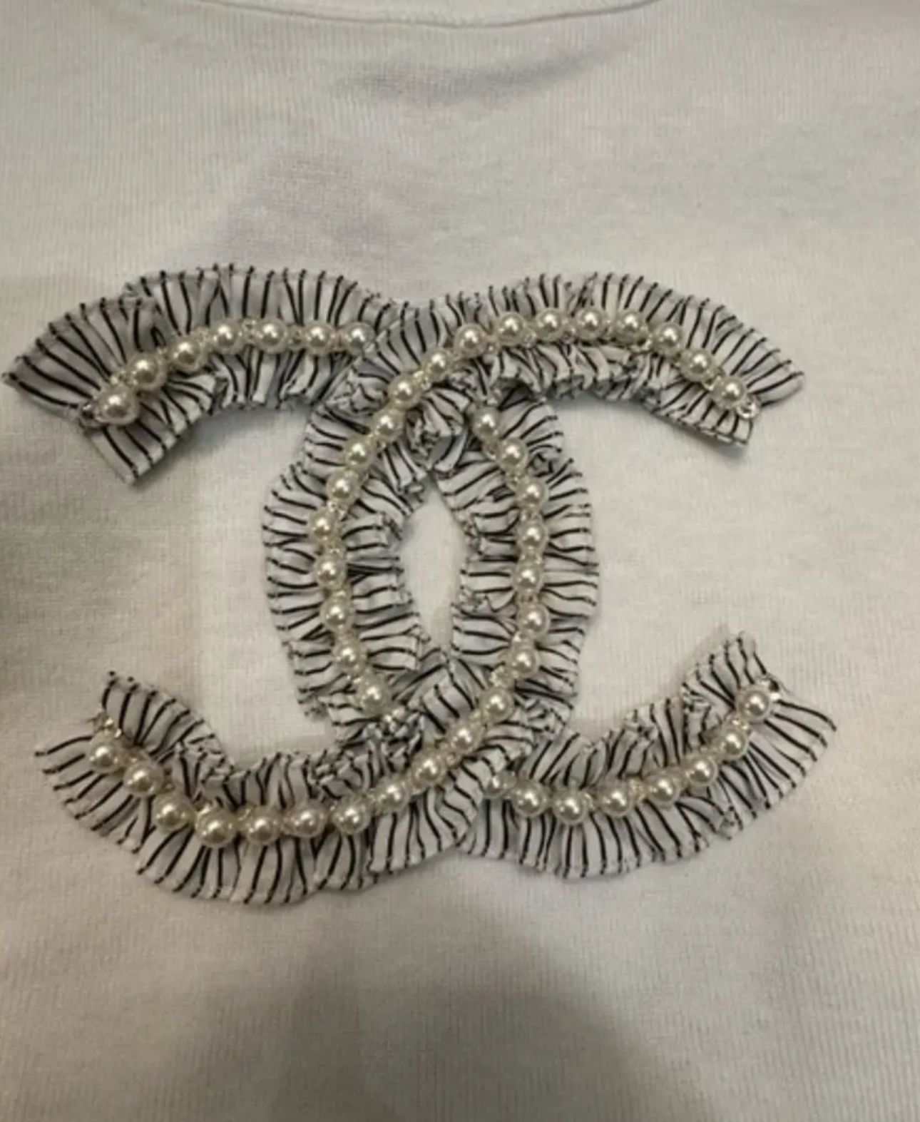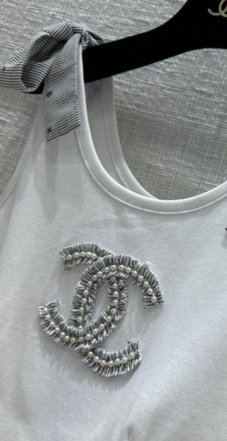 CHANEL TOP WITH PEARL LOGO DETAIL AND STRIP DETAIL IN WHITE