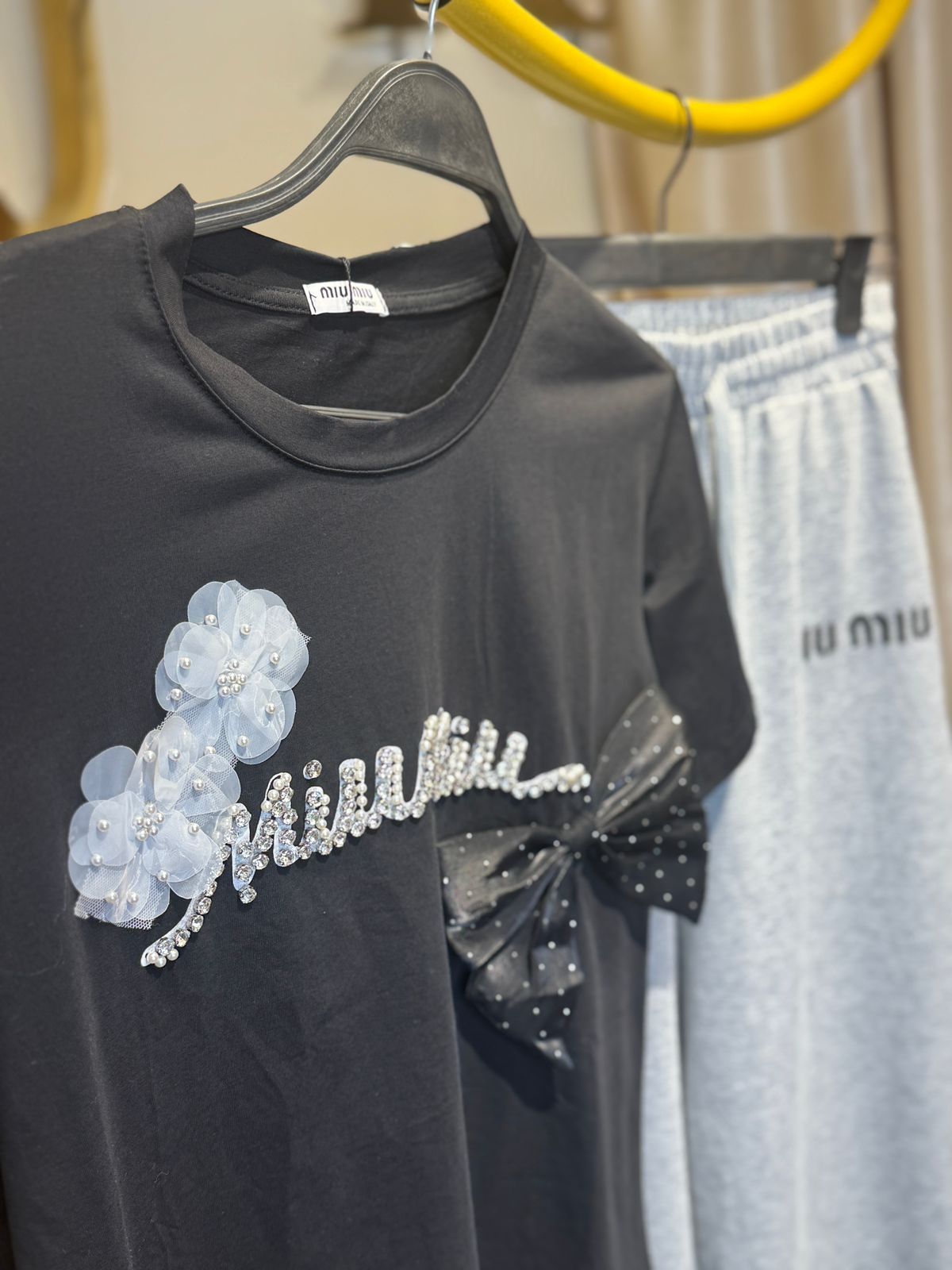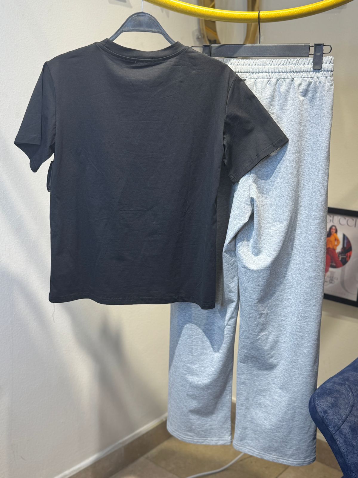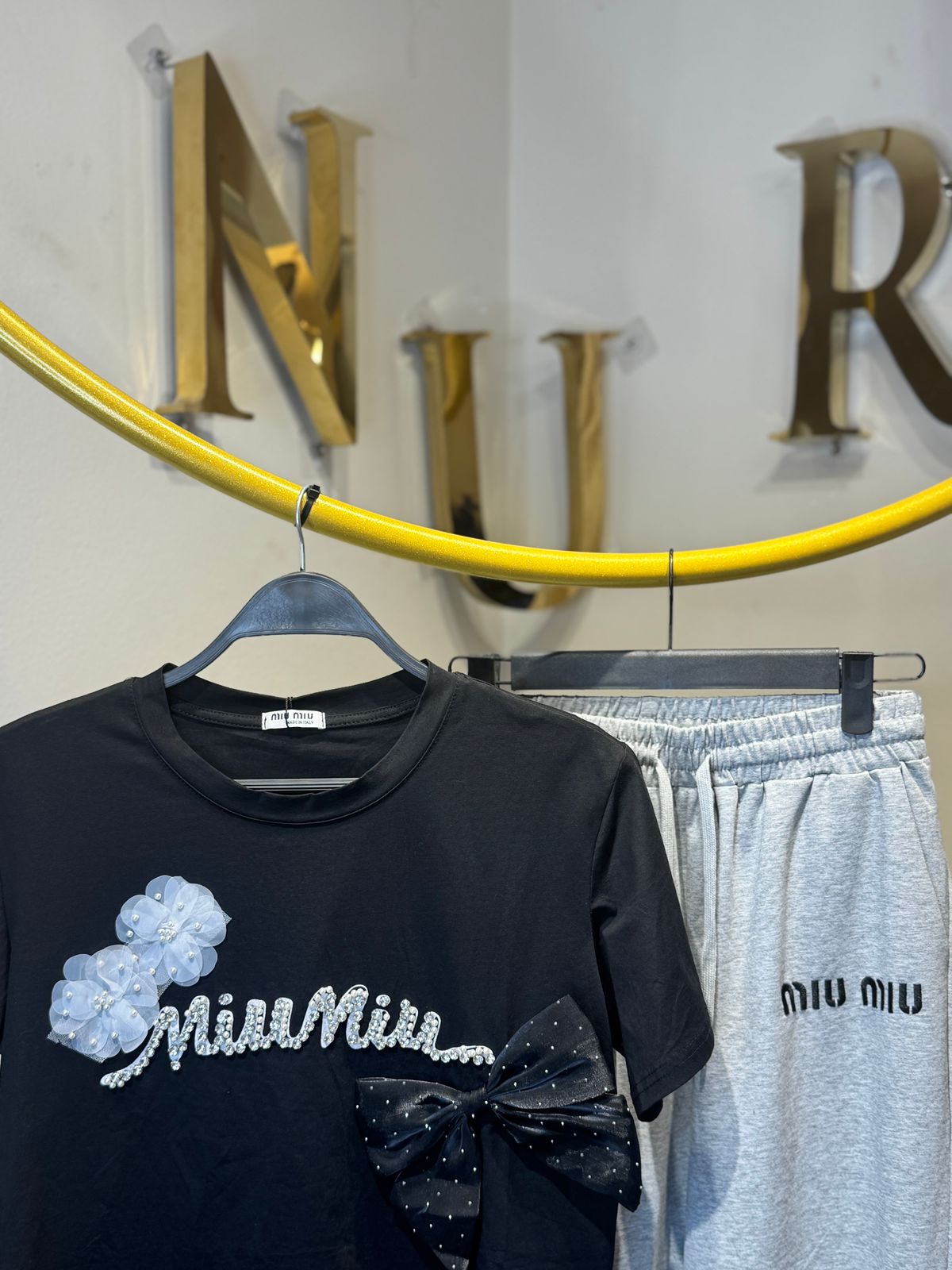 MIU MIU SET WITH BLACK T SHIRT AND GRAY SEWATPANTS