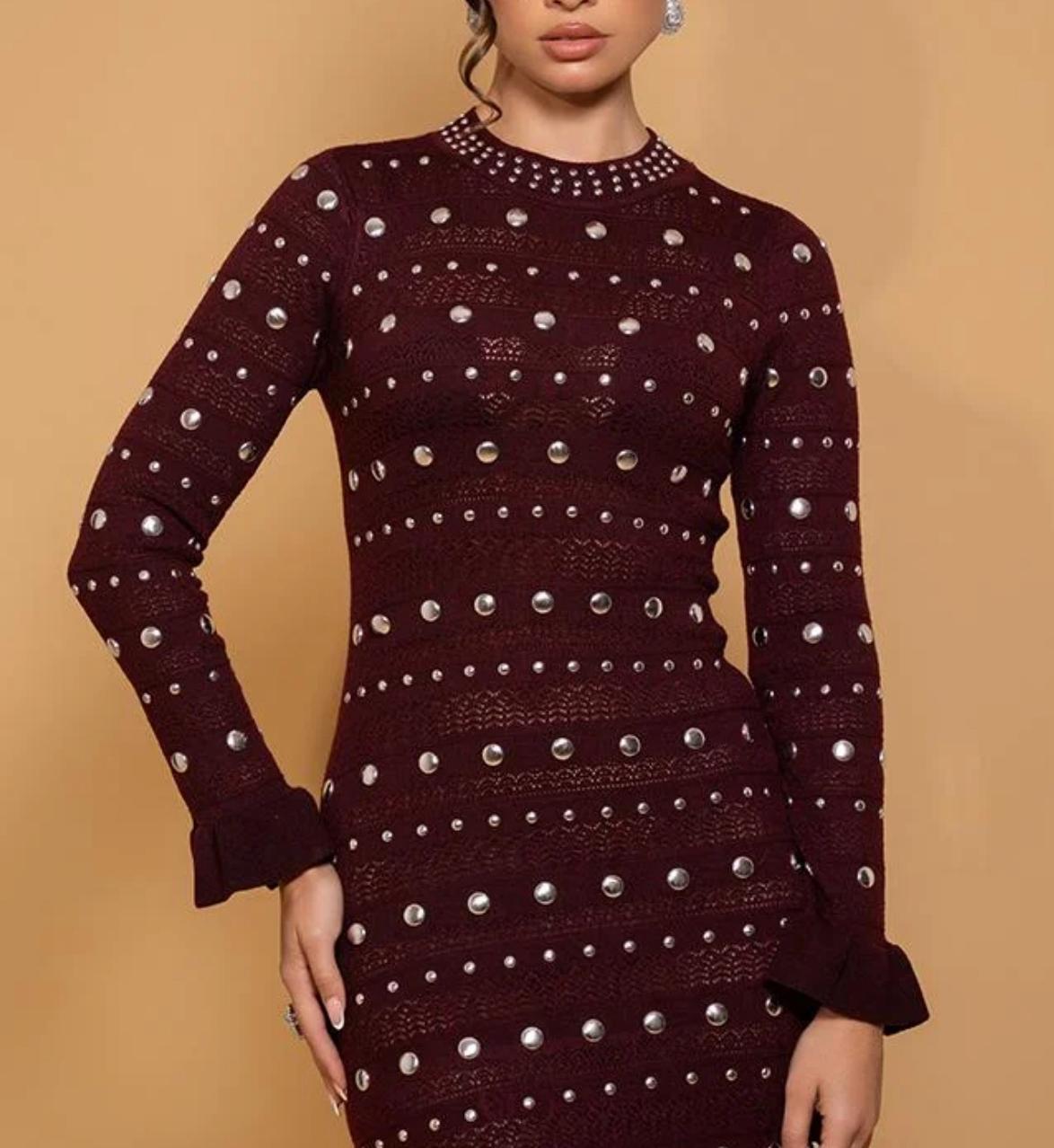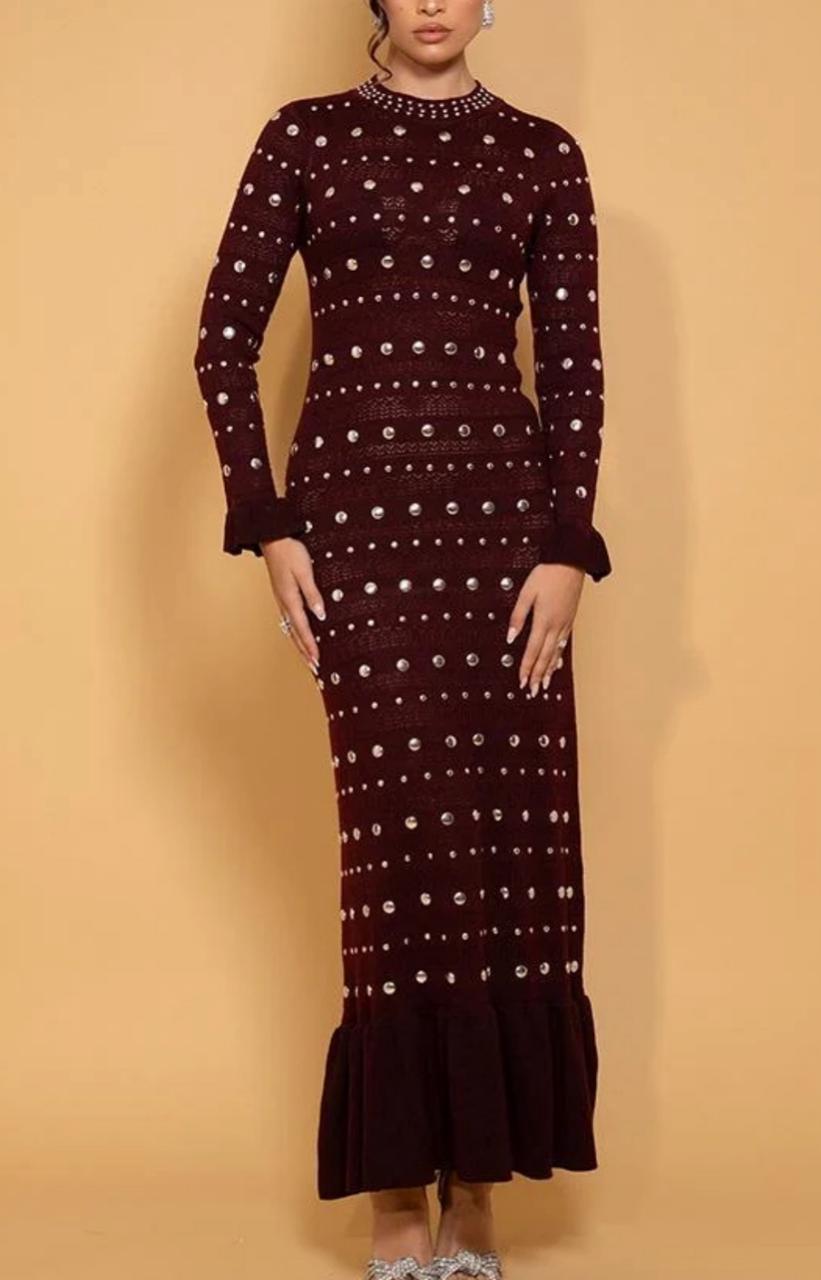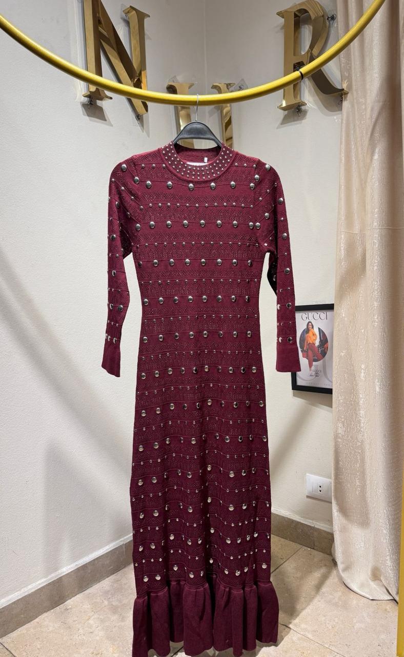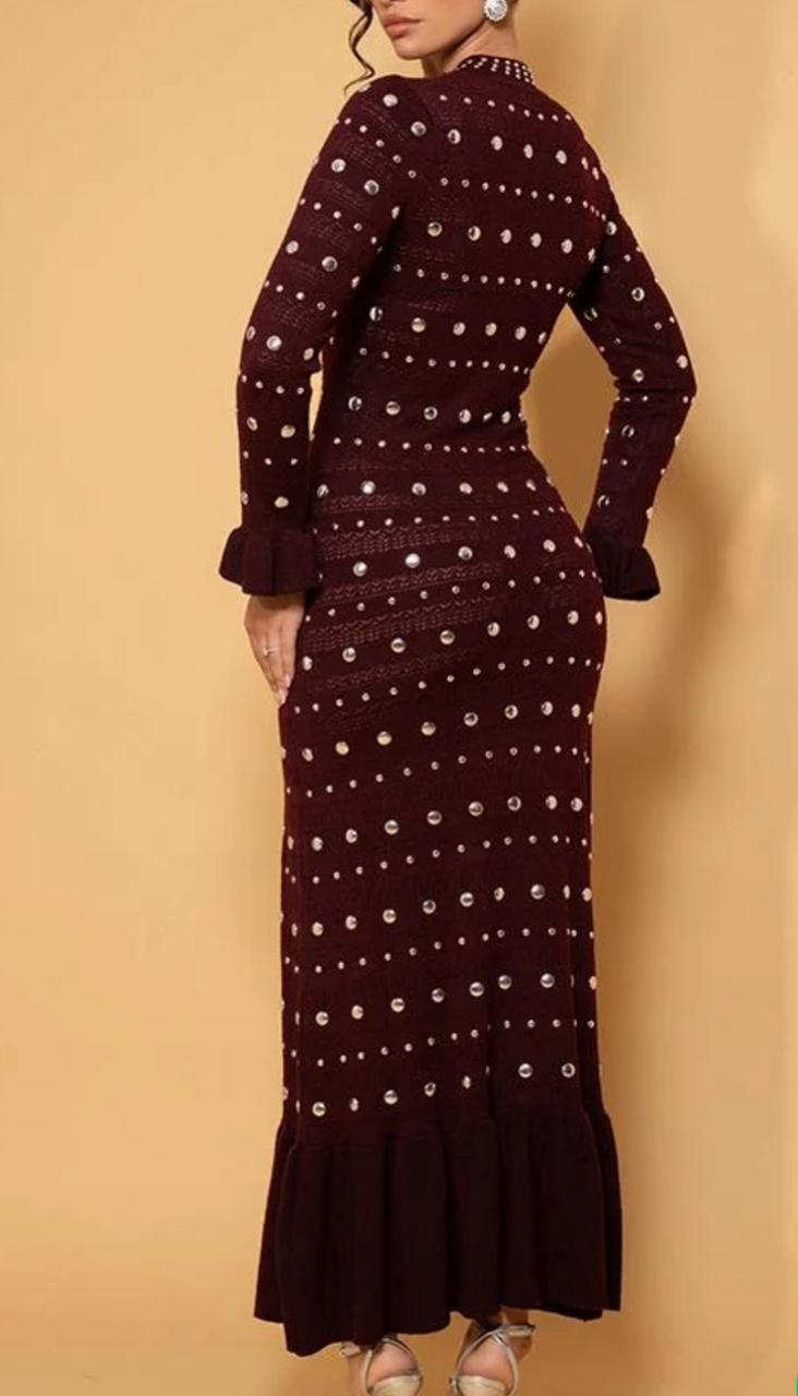 SANDRO LONG DRESS WITH STUDDED CROCHET KNIT MAXI DRESS IN RED