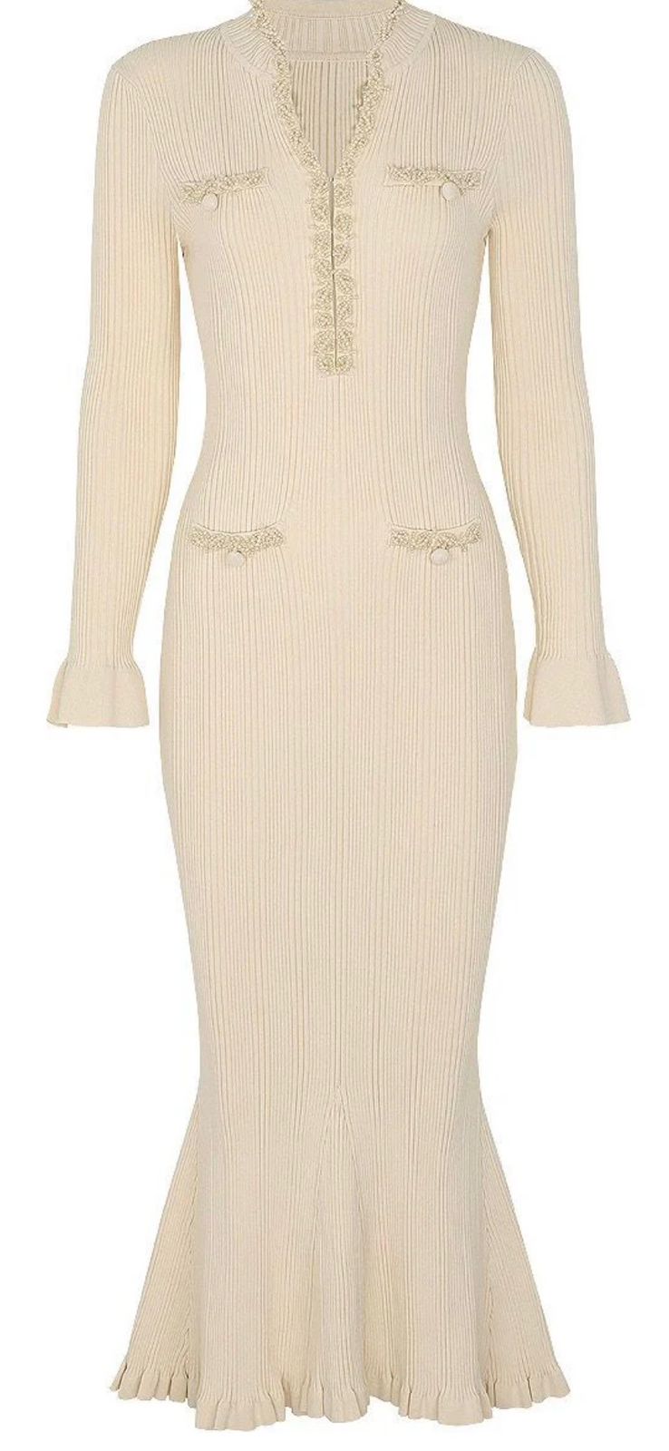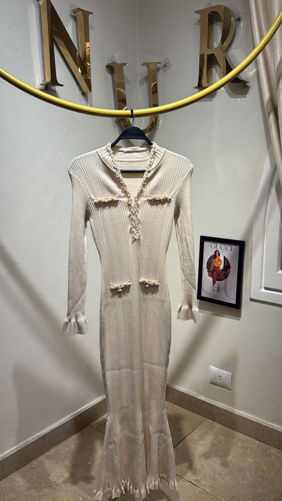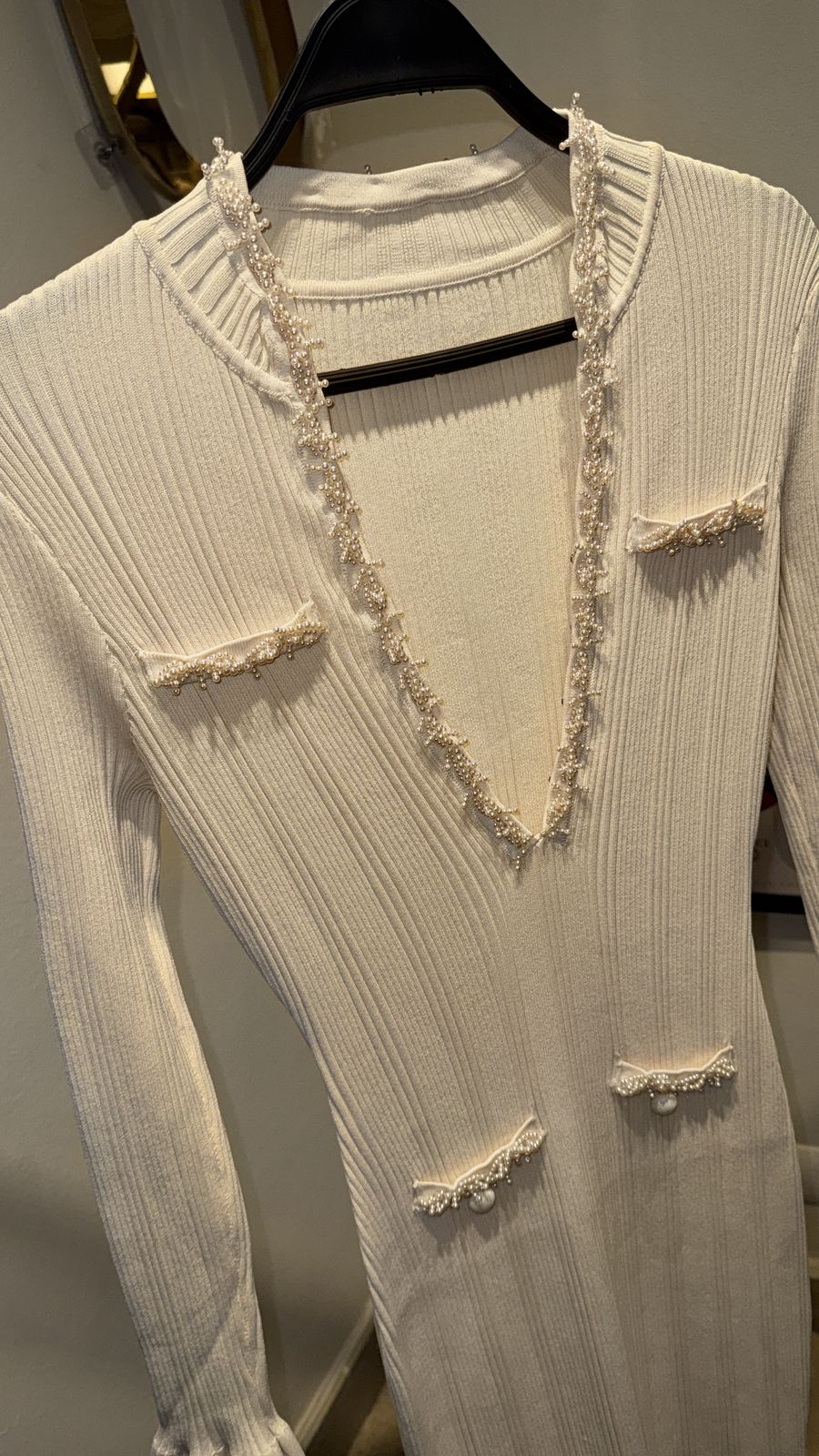 Sandro knit long sleeve maxi dress in beige with pearl details