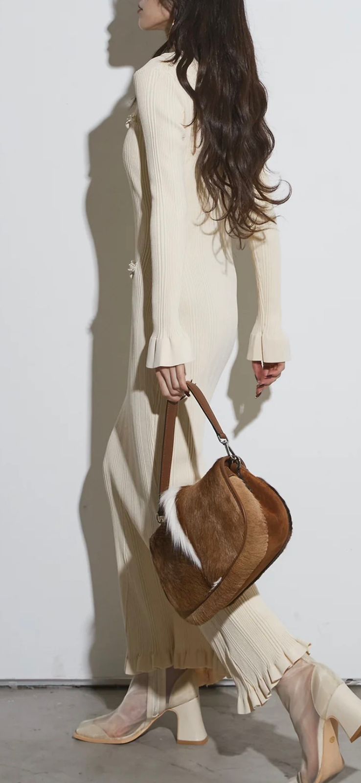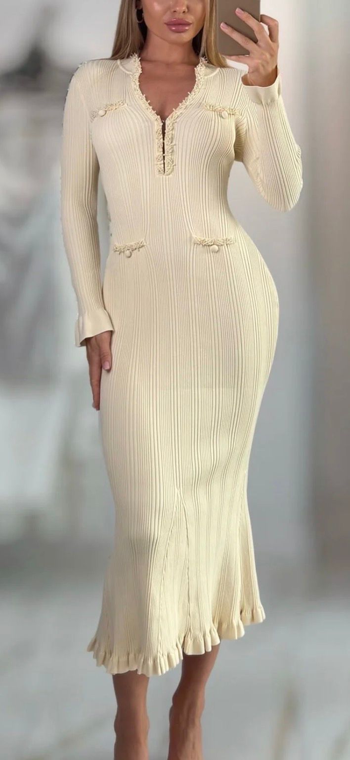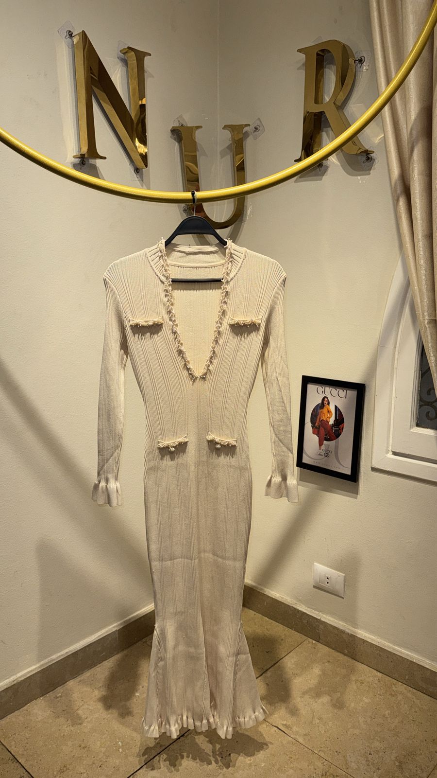 Sandro knit long sleeve maxi dress in beige with pearl details